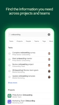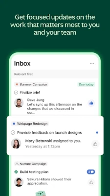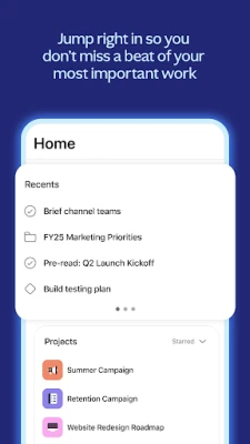 Asana inakuza tija yako binafsi na ya timu kwa kukupa uwezo wa kuzingatia yale muhimu zaidi. Ukiwa na sehemu ya "Kazi Zangu", unaweza kuona majukumu yote uliyopewa katika orodha moja iliyopangwa vizuri. Panga vipaumbele kwa urahisi kwa kuburuta na kuweka kazi, unda sehemu zako maalum za orodha ya kufanya, au panga kulingana na vigezo mbalimbali ili kuboresha umakini wako. Endeleza ushirikiano bila vikwazo; wasiliana na wenzako kwa kuweka 'like', kutoa maoni, au kuambatanisha faili moja kwa moja kwenye majukumu. Pia, pokea masasisho ya kiotomatiki kuhusu miradi na kazi zinazokuhusu moja kwa moja kwenye kikasha chako.